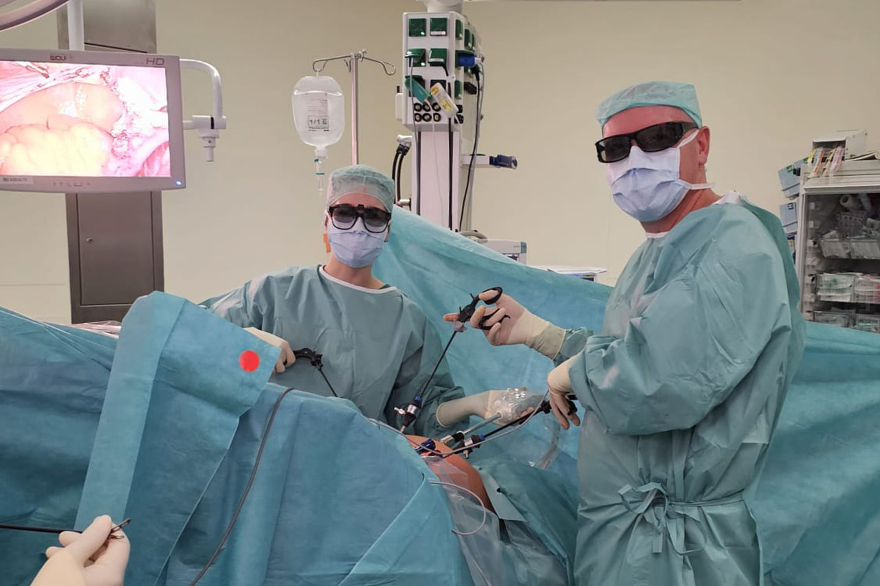 Zur weiteren Perfektionierung urogynäkologischer Eingriffe setzen wir in unserer Klinik modernste 3D-Laparoskopie ein. Diese innovative Technologie bietet dem Operateur eine dreidimensionale, hochauflösende Sicht auf das Operationsgebiet und damit eine deutlich verbesserte Tiefenwahrnehmung im Vergleich zur herkömmlichen 2D-Laparoskopie. Die präzisere Handhabung der Instrumente, kürzere Operationszeiten und minimierte Gewebetraumatisierung führen zu besseren funktionellen und ästhetischen Ergebnissen sowie zu einer schnelleren Erholung unserer Patientinnen. Die 3D-Laparoskopie ist für uns ein wichtiger Baustein, um höchste Präzision und Sicherheit bei komplexen Beckenboden- und Inkontinenzoperationen zu gewährleisten.