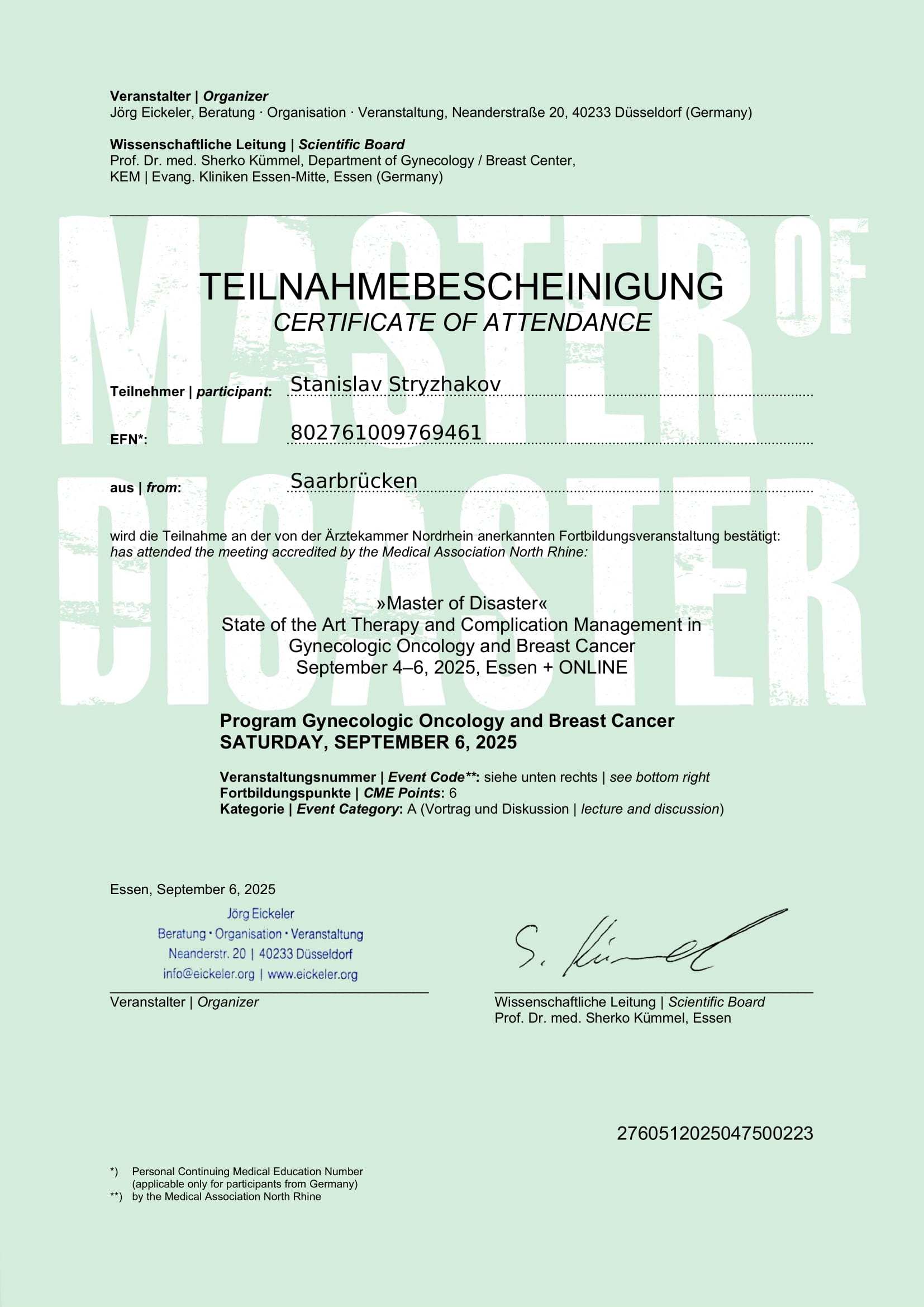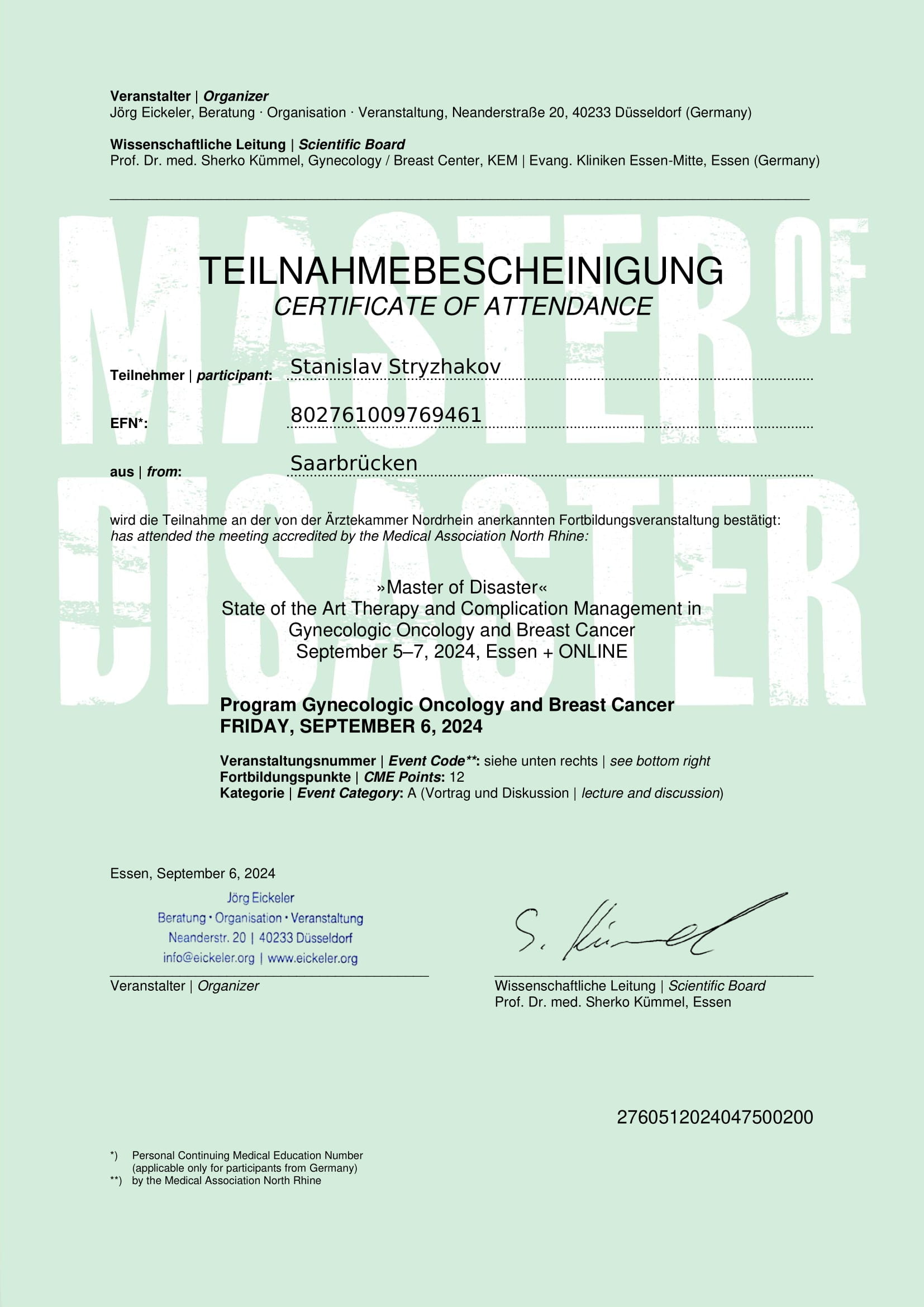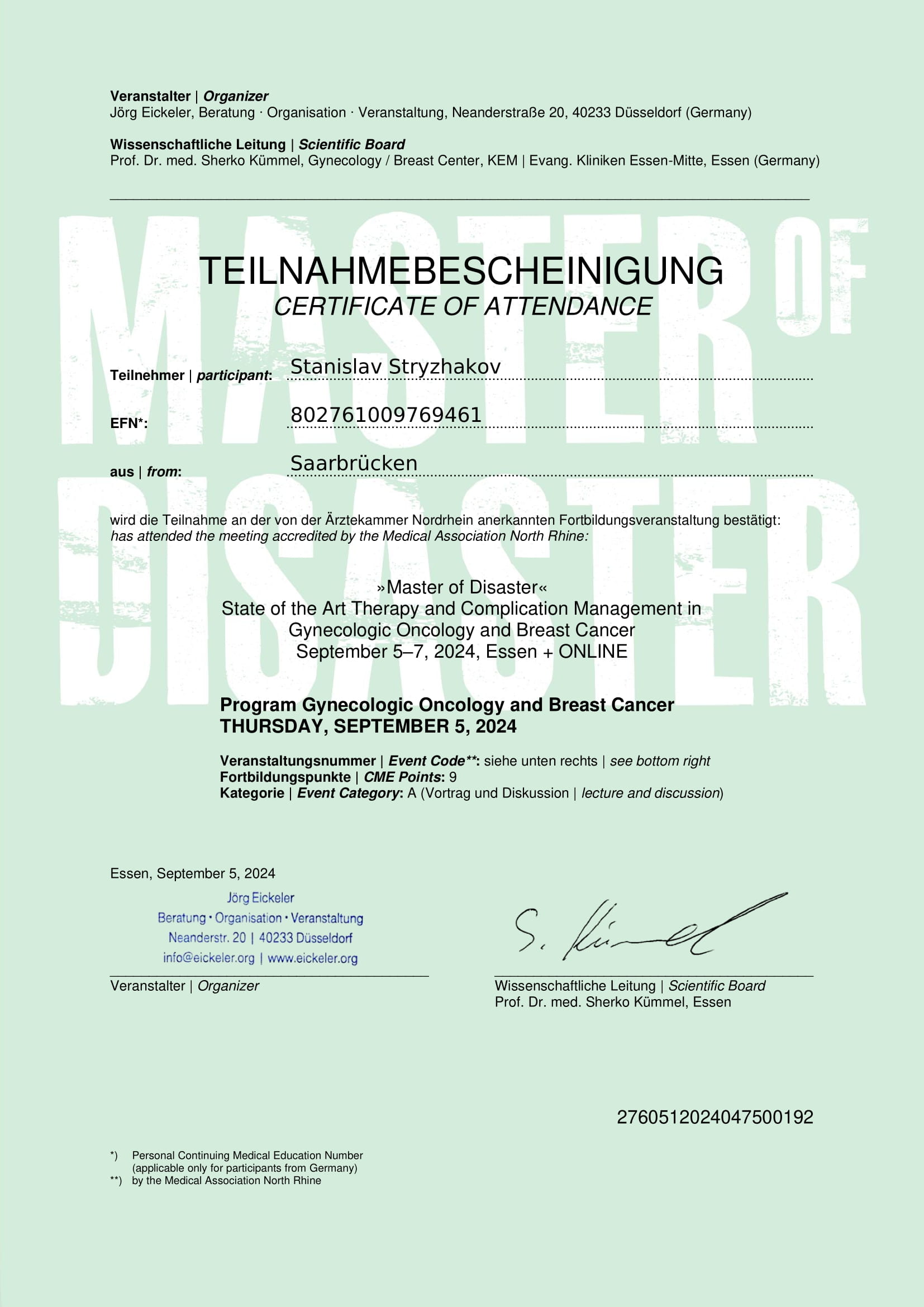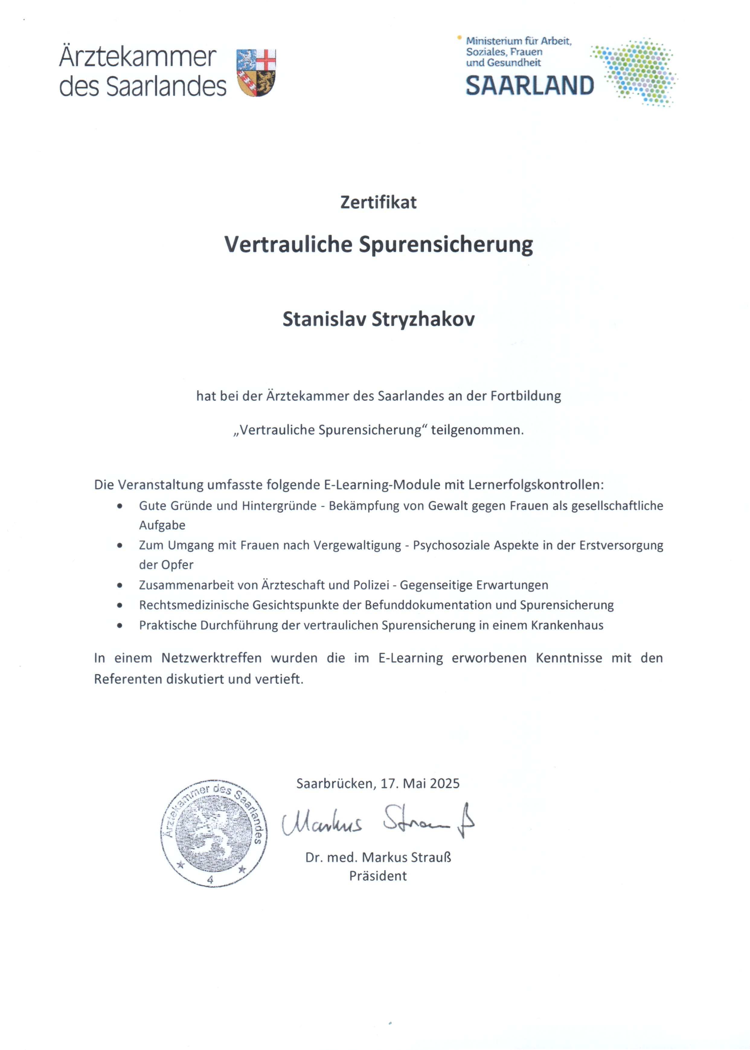 2015 studierte er an der TU "Kolposkopie in der Diagnose von präkanzerösen und tumorösen Zuständen der Zervix" an der Charkiwer Medizinischen Akademie für Weiterbildung.