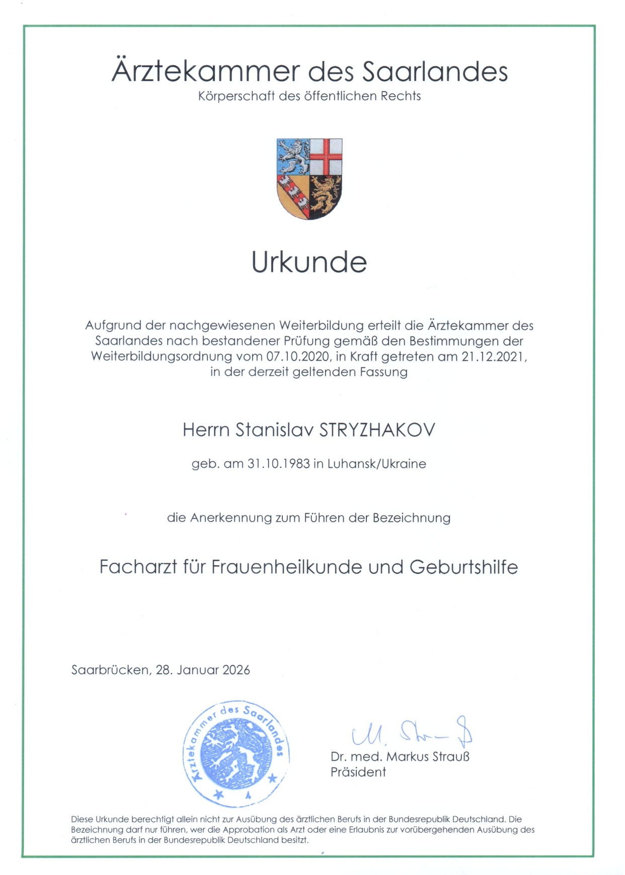2011 erhielt er die Kategorie 2 in der Fachrichtung Geburtshilfe und Gynäkologie.