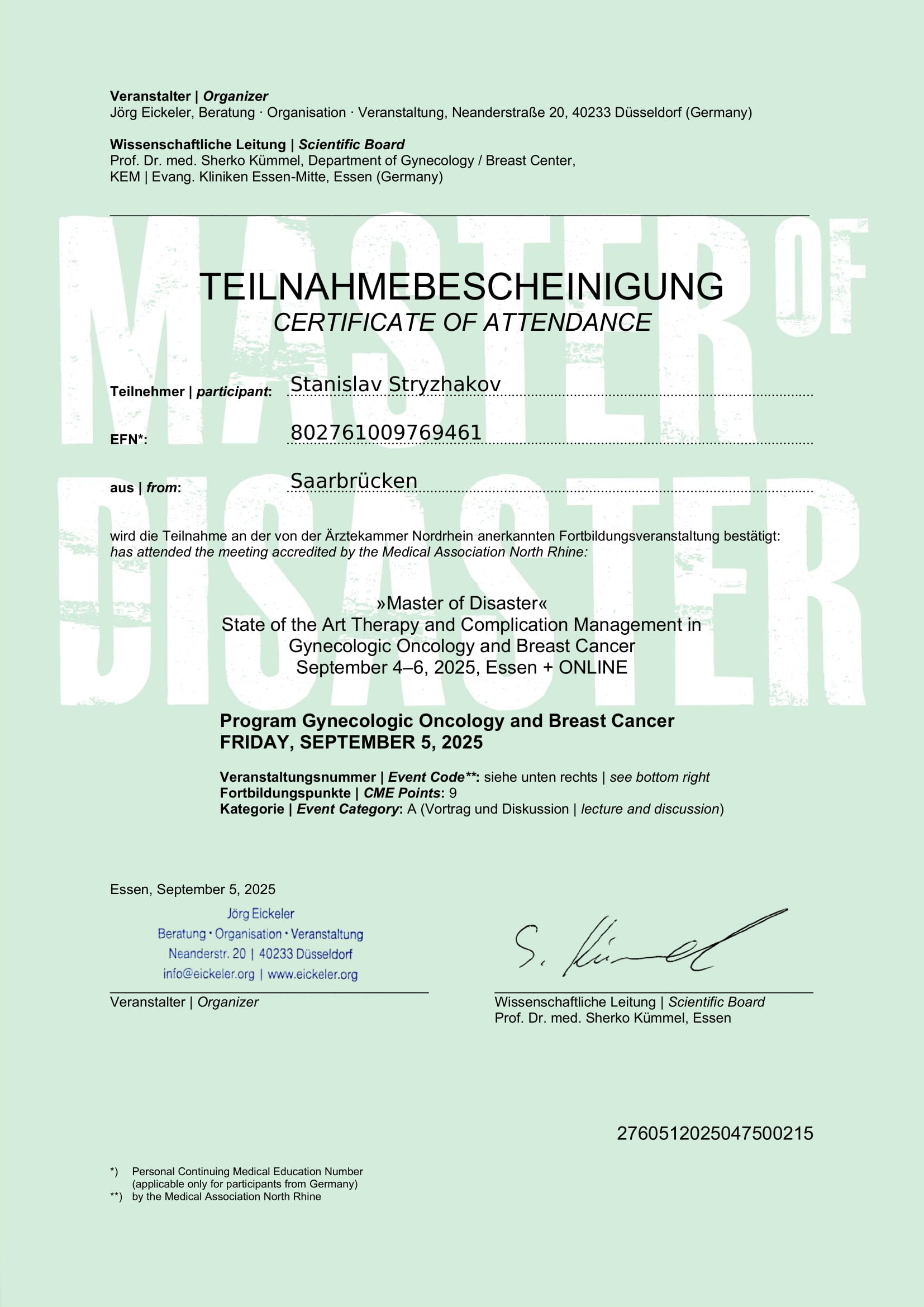 Seit 2018 ist er Facharzt für die Fachrichtung "Onkogynäkologie".